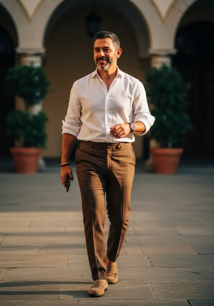 Crisp White Shirt with Warm Brown Tailored Pants