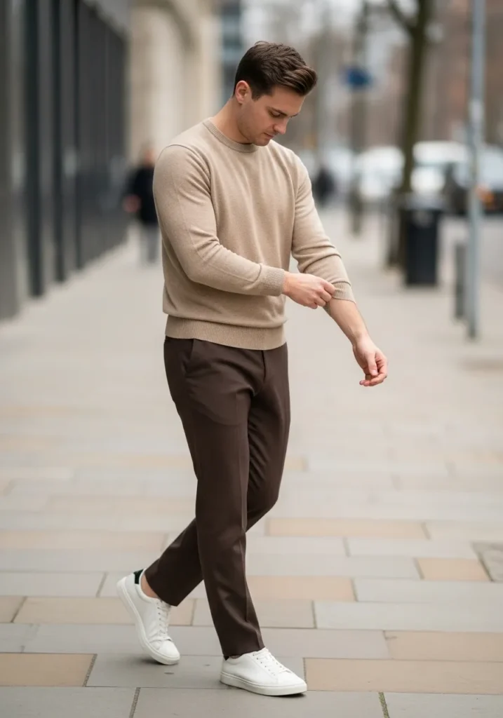 This outfit keeps things sleek and understated with dark brown tailored trousers and a soft beige knit sweater. The pants have a smooth finish with clean lines down the leg and subtle natural folds as he moves. The sweater fits close to the body without feeling tight, giving a refined silhouette that still looks comfortable. Crisp white sneakers add a fresh contrast and keep the whole look grounded in that modern casual space we all love.