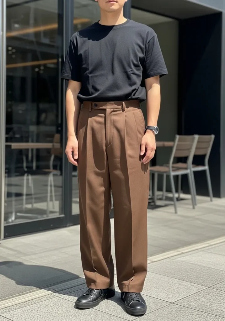 Relaxed Pleated Brown Trousers with Black Tee