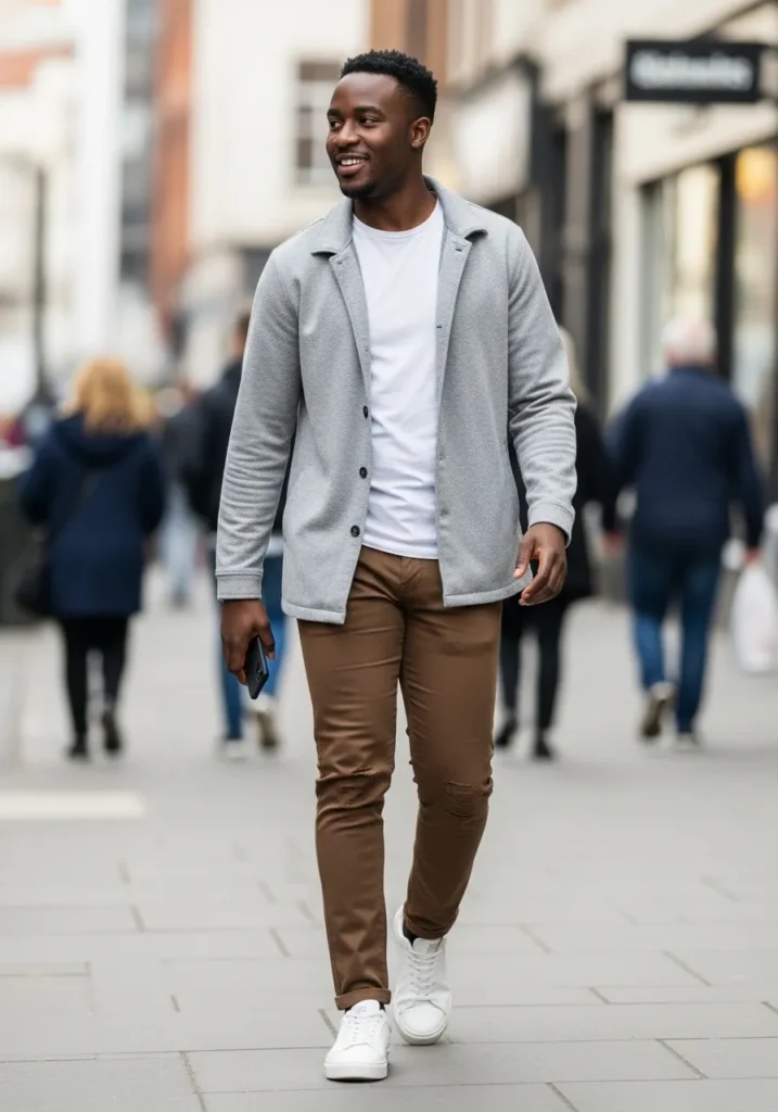 This look layers slim brown chinos with a crisp white T shirt and a soft gray overshirt worn open. The chinos have a clean tailored fit with slight natural creasing at the knees that makes them feel lived in but still polished. The gray layer adds structure without feeling heavy, and the white sneakers keep everything fresh and easy. The overall vibe feels relaxed city style with just enough intention behind it.