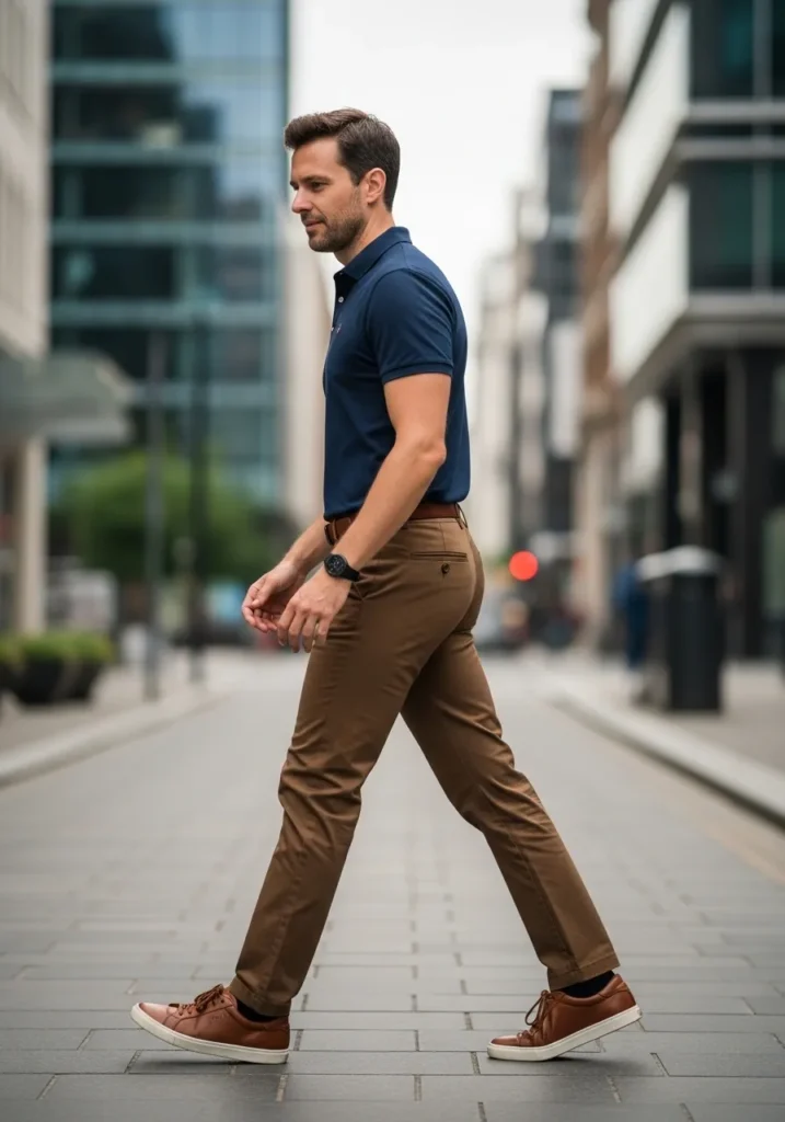 This outfit keeps things sharp and sporty with slim brown chinos and a fitted navy polo shirt. The pants have a smooth tailored cut that follows the leg cleanly with subtle natural creasing at the knees. The deep navy top adds contrast while still feeling refined and grown up. Brown leather sneakers echo the tone of the trousers and keep the whole look cohesive and modern.