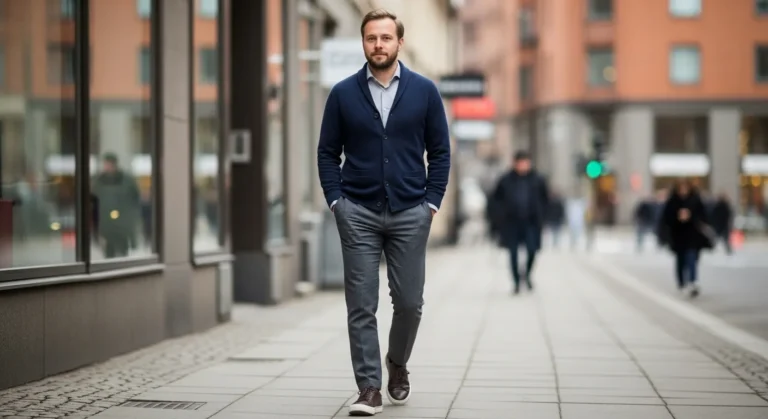 A dark knit cardigan is layered over a light button up shirt and paired with slim gray tailored trousers. The layers add depth while keeping the look clean and classic. Brown shoes add a subtle contrast that keeps everything cohesive.