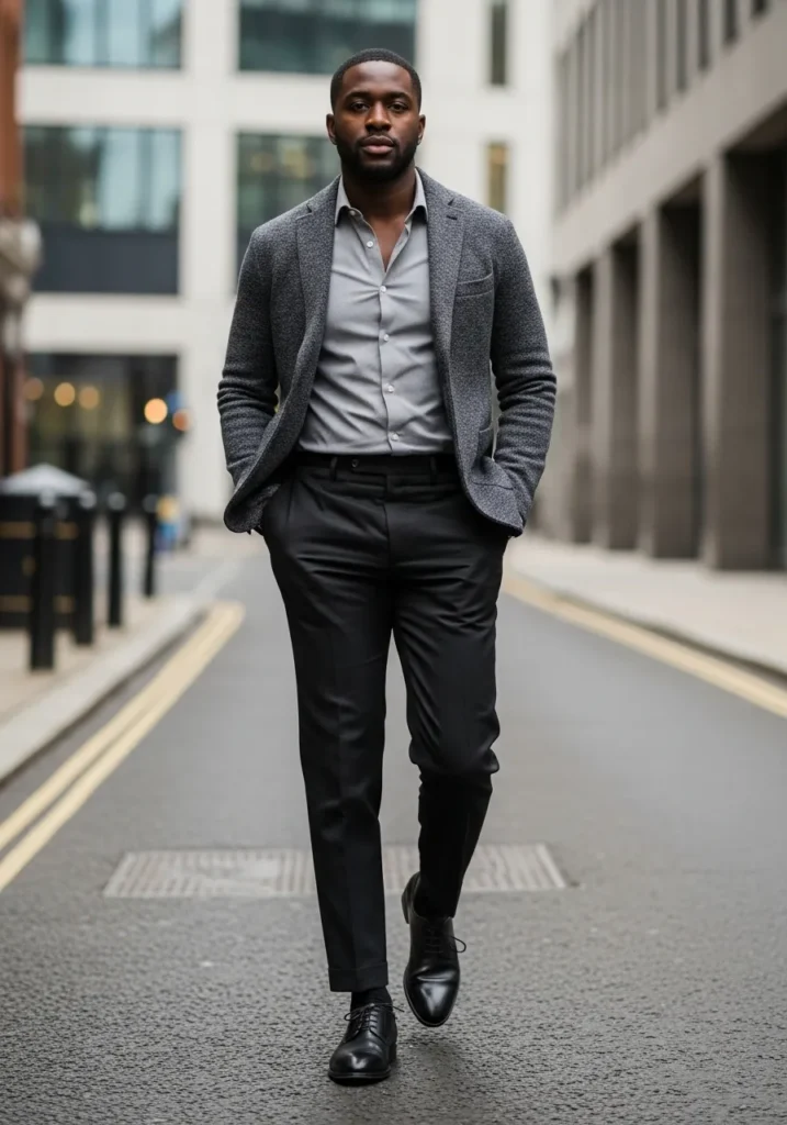 This look features a textured grey blazer layered over a light shirt and slim black trousers. Black dress shoes keep everything streamlined and professional. The silhouette is clean and modern with a strong city feel.
