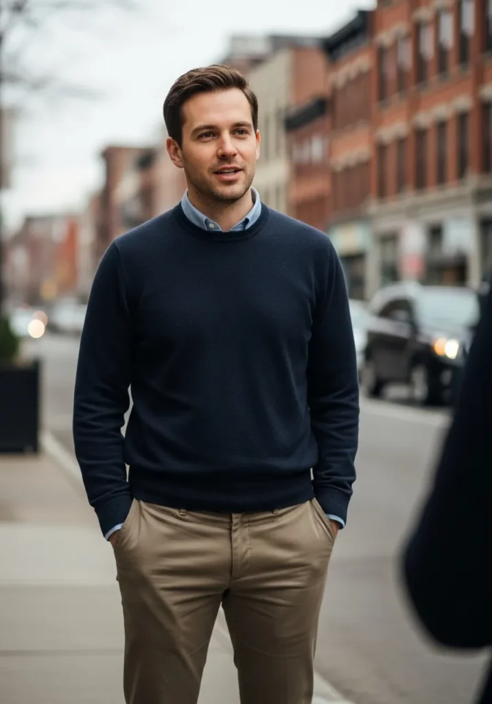 This look swaps the blazer for a navy knit sweater paired with beige tailored trousers. The outfit feels simple and approachable while still looking polished. Dark shoes keep it interview ready.