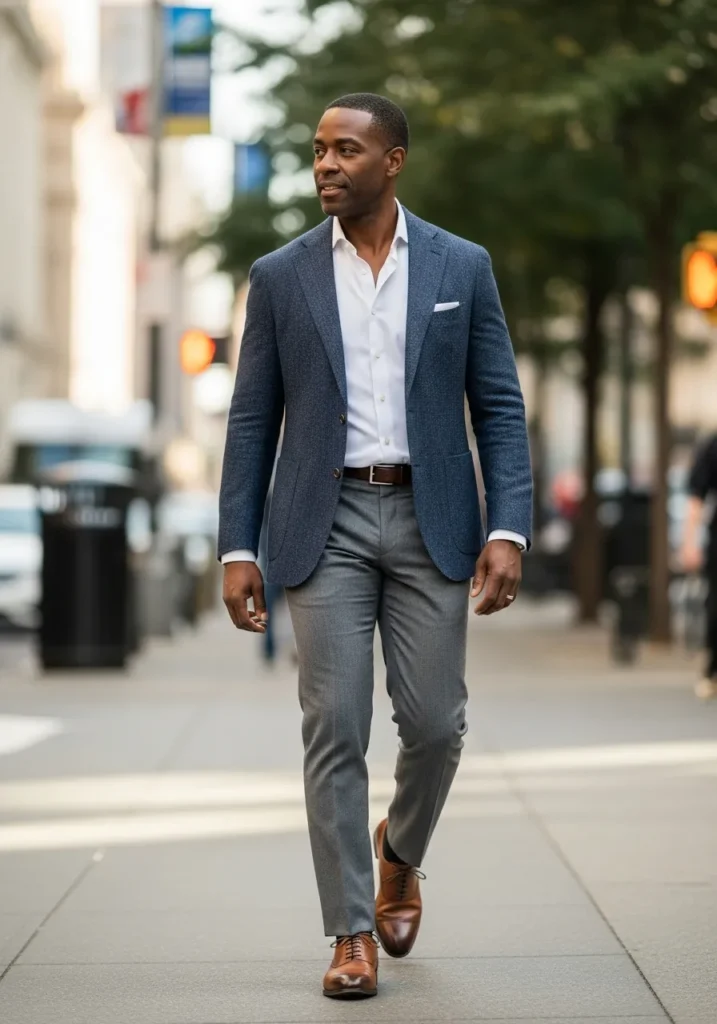 This outfit combines a navy blazer with a crisp light shirt and grey tailored trousers. Brown shoes add warmth and keep the look balanced. The overall vibe feels polished and dependable.