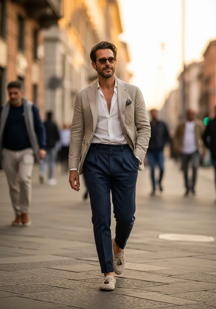 Here we have a light beige blazer worn with a white shirt and navy tailored trousers. The fabric looks breathable and soft, perfect for warmer weather or travel days. Casual sneakers instead of dress shoes give it a relaxed edge while still keeping things clean and intentional.