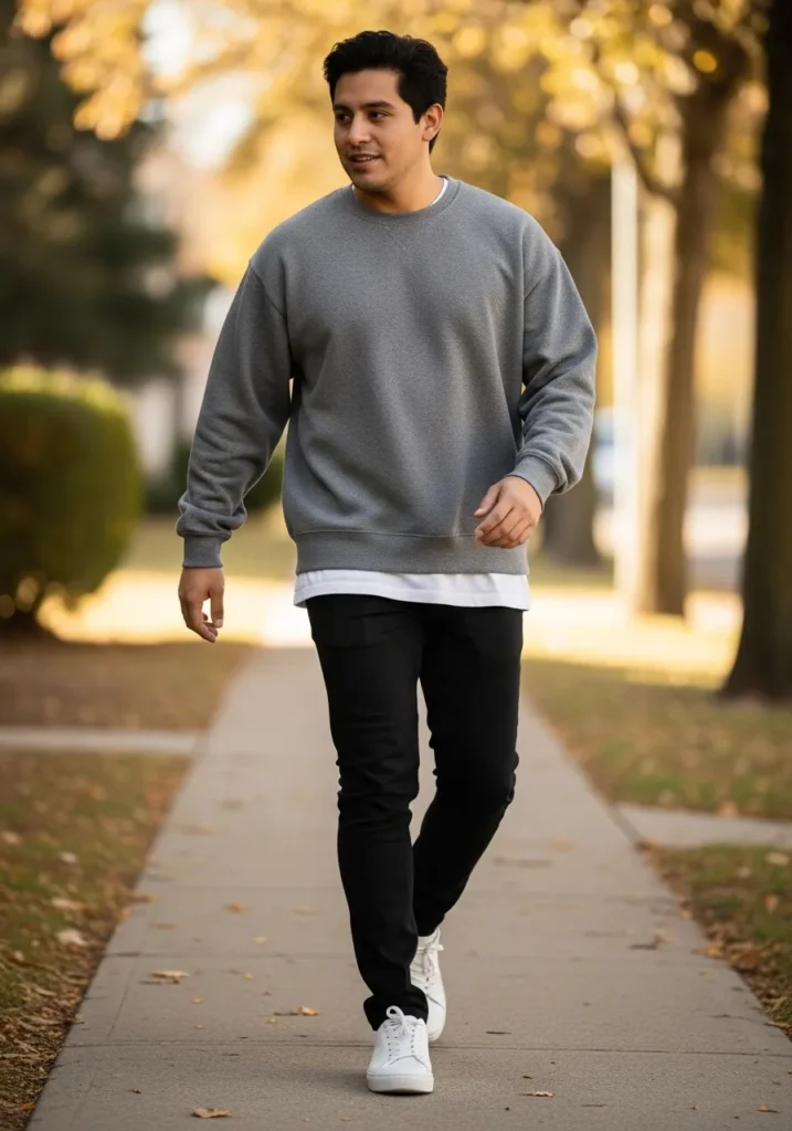 A relaxed sweatshirt layered over a longer shirt creates an easygoing fall outfit, paired with dark pants and sneakers. The silhouette feels modern and comfortable.
