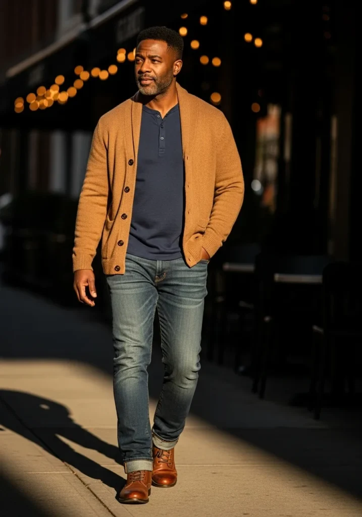 This outfit uses a warm toned cardigan layered over a dark top, paired with jeans and boots. The textures feel soft and inviting.