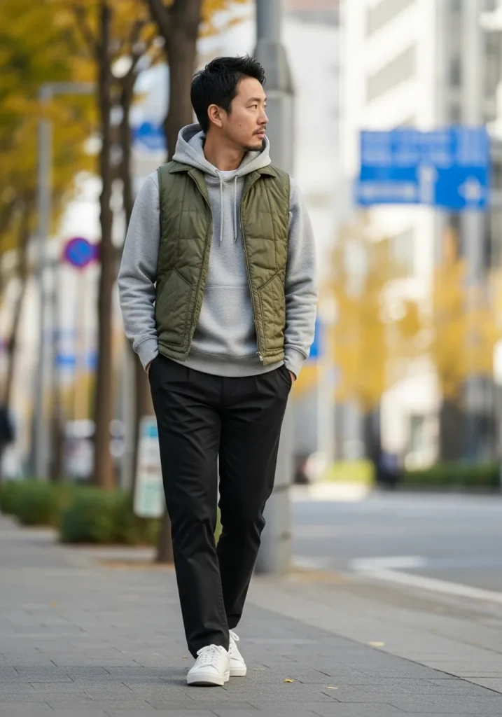 A lightweight puffer vest layered over a hoodie creates a sporty fall look, finished with slim pants and sneakers. The layers feel practical and season appropriate.