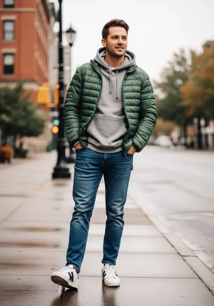 This outfit features a green puffer jacket layered over a gray hoodie, paired with classic blue jeans and clean white sneakers. The fabrics look soft and practical, giving off a cozy fall feel that still looks fresh and wearable for everyday walks.