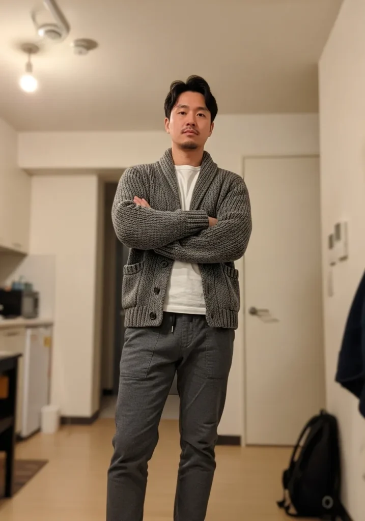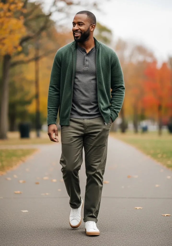 Here we have a deep green knit cardigan worn over a simple gray T shirt, styled with relaxed olive trousers and white sneakers. The textures feel warm and inviting, while the muted colors keep everything grounded and calm.