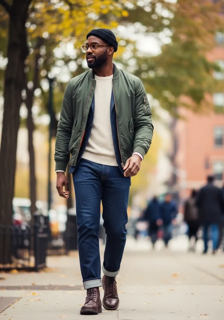 This look pairs an olive bomber jacket with a light sweater, dark jeans, and leather boots. The layers feel balanced and practical, perfect for crisp fall days spent walking around the city.