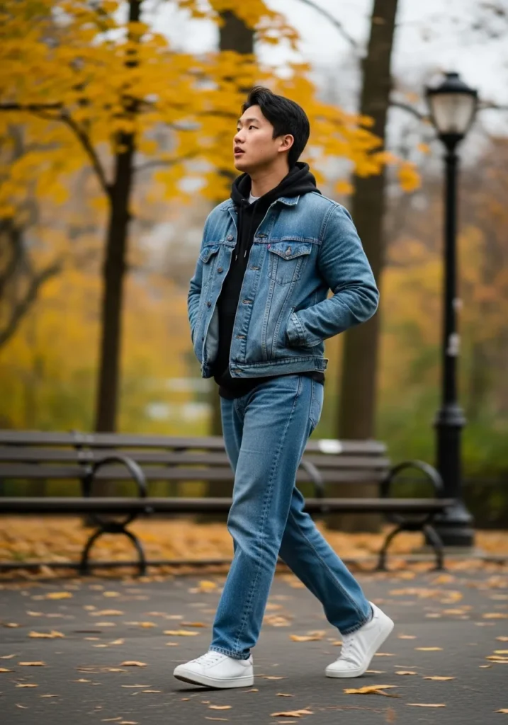 A denim jacket layered over a hoodie creates a timeless fall look, paired with blue jeans and white sneakers. The fabrics feel casual and familiar, making the whole outfit feel relaxed and easy.