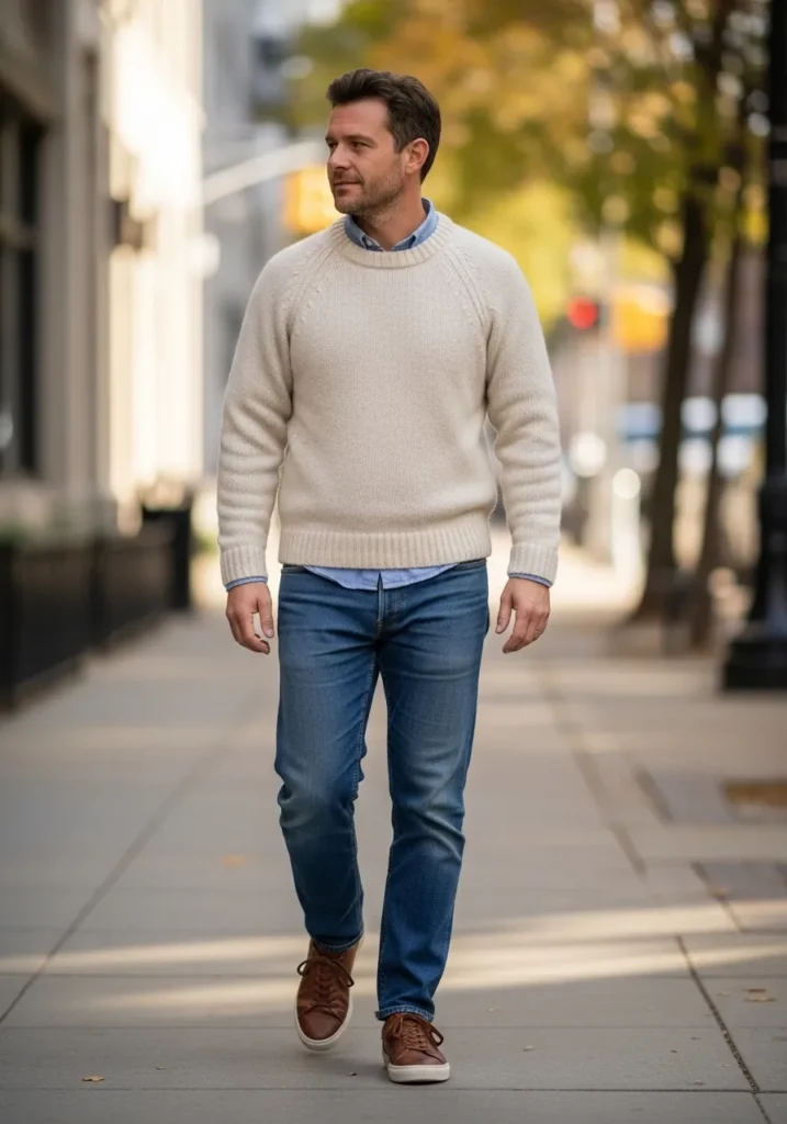 This look features a neutral knit sweater layered over a crisp collared shirt, paired with classic blue jeans and casual leather shoes. The textures feel soft and lived in, and the muted tones fit perfectly into a cozy fall palette without feeling heavy.