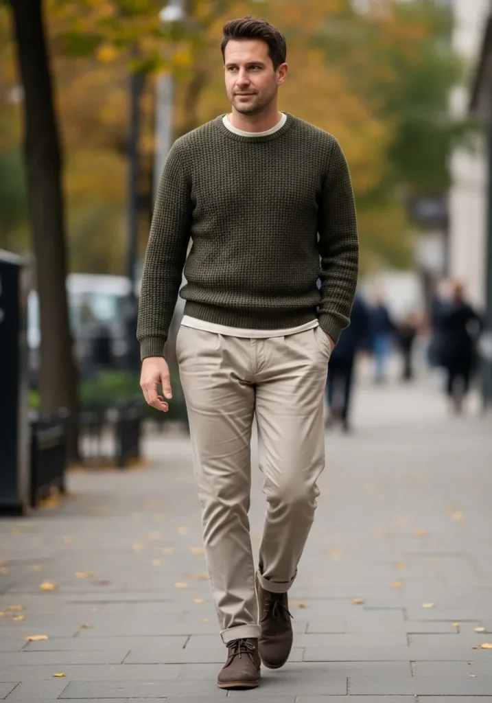 A simple olive knit sweater is paired with light beige trousers and casual shoes. The fabrics look soft and breathable, giving the outfit a clean and calm fall aesthetic.