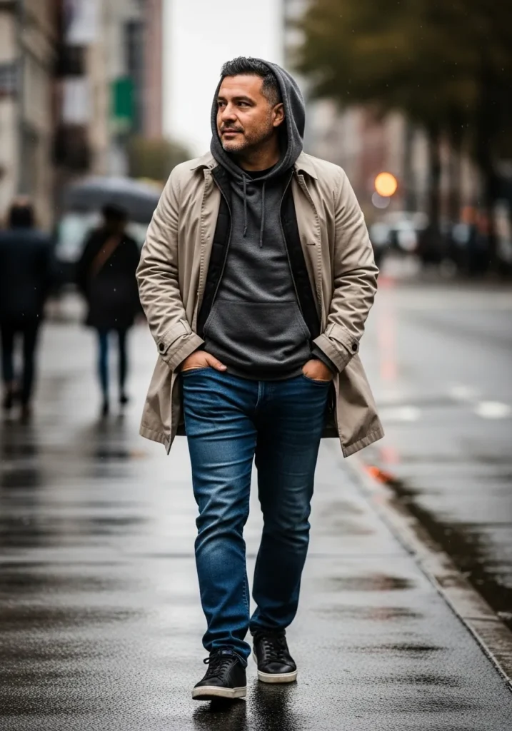 Here we see a lightweight jacket worn over a charcoal hoodie, styled with dark denim and relaxed sneakers. The layers feel practical and urban, perfect for cooler days when comfort really matters.