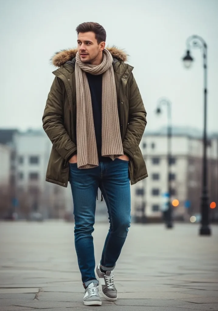 This outfit features a parka style jacket layered with a scarf, paired with jeans and casual shoes. The layers feel warm and practical, perfect for cooler fall days.