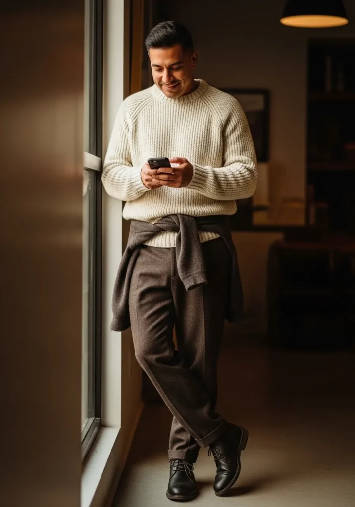 A soft cream knit sweater is paired with relaxed dark trousers for an indoor fall look. The fabrics look comfortable and warm, ideal for slower days.