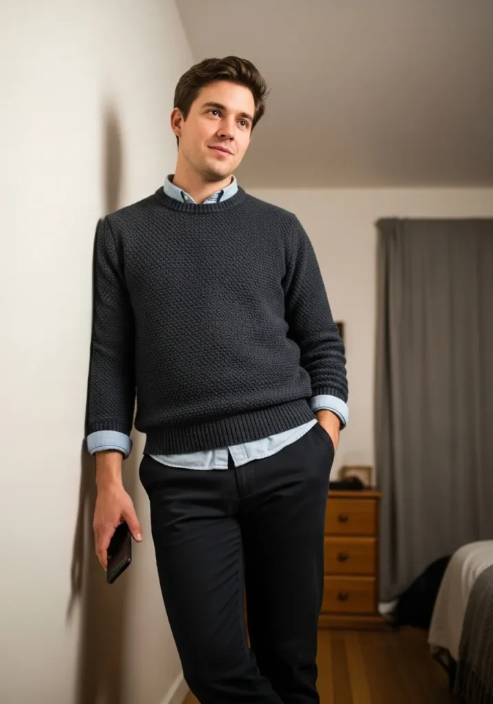 This look pairs a dark sweater layered over a collared shirt, styled with slim black trousers. The layers feel neat and intentional while staying comfortable.