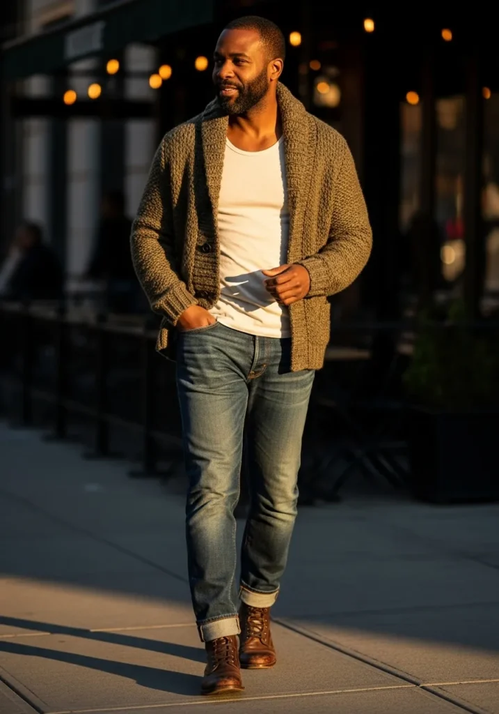 This look features a textured cardigan layered over a white tee, styled with dark jeans and boots. The warm lighting and soft layers make the outfit feel extra inviting.