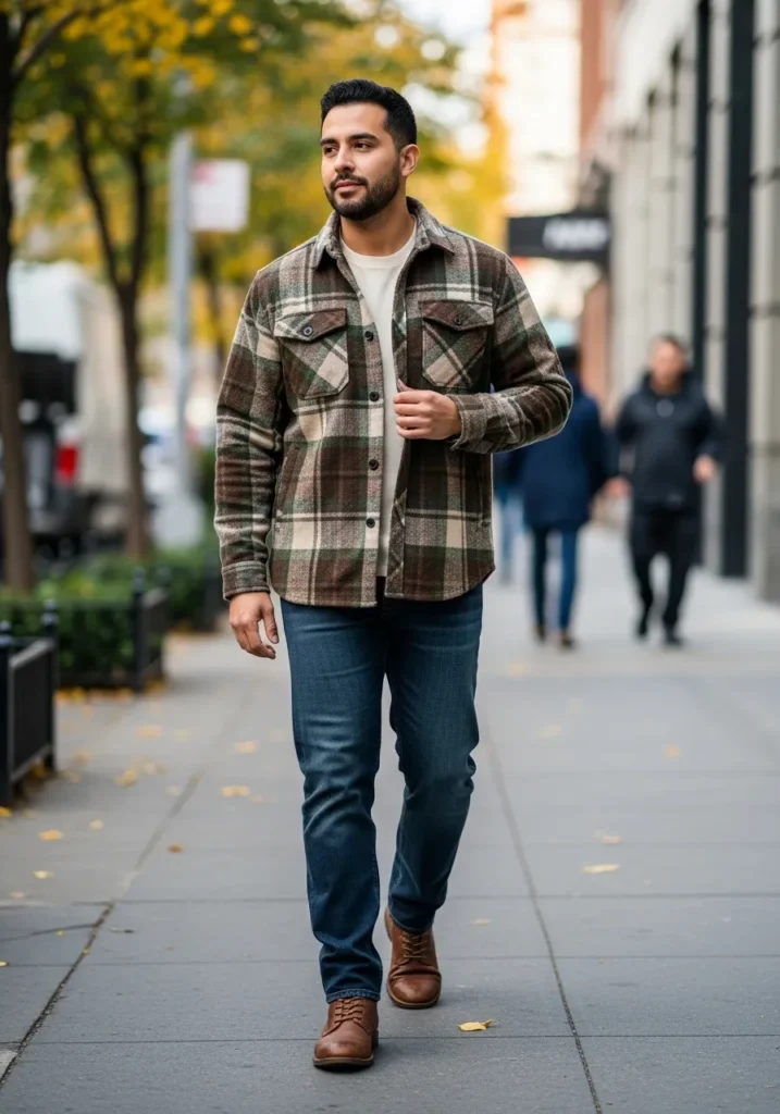 A plaid overshirt layered over a simple top gives this outfit a classic fall feel, paired with jeans and sturdy boots. The pattern adds depth while keeping the look grounded.