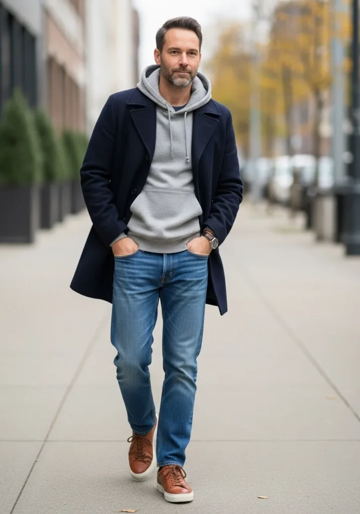 This outfit layers a hoodie under a tailored casual coat, paired with jeans and leather shoes. The mix of relaxed and structured pieces creates a balanced fall look.