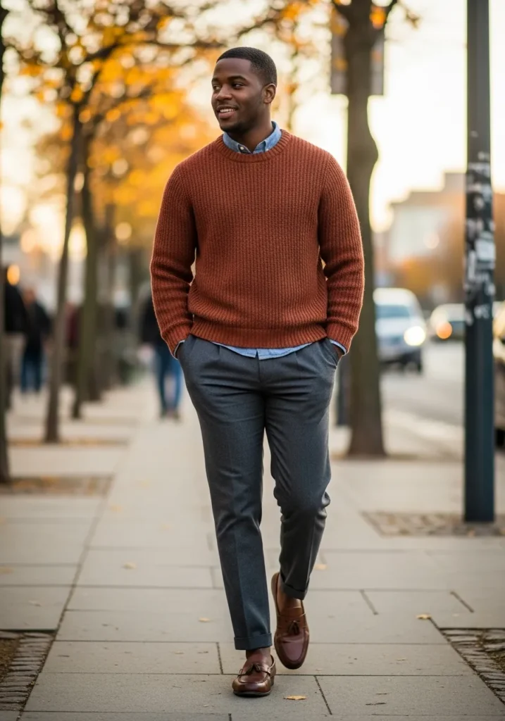 A rust colored sweater takes center stage here, paired with dark trousers and polished shoes. The fabric looks soft and comfortable, perfect for crisp fall days.