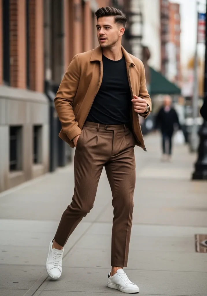 Camel Jacket and Brown Tailored Pants with Clean White Sneakers