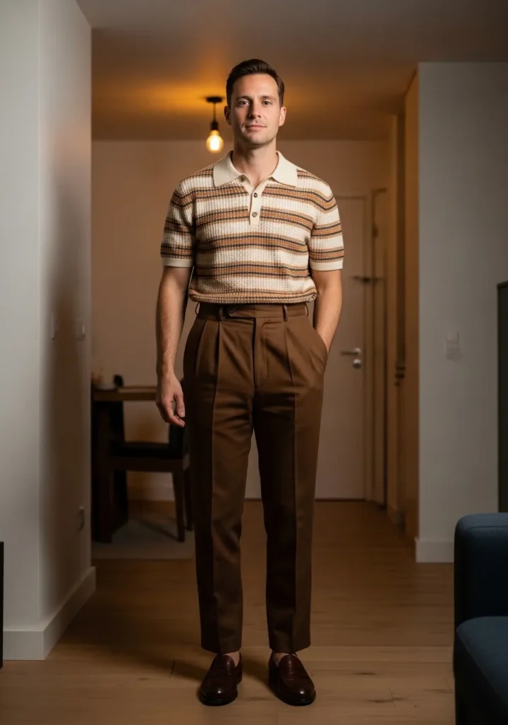 This look pairs rich chocolate brown trousers with a soft knit striped polo in warm beige and caramel tones. The pants sit slightly higher on the waist with subtle pleats that create a clean, elongated line through the leg. Dark brown loafers complete the outfit and keep the palette cohesive. The overall feel is refined but relaxed, with a gentle nod to vintage style that still feels current.