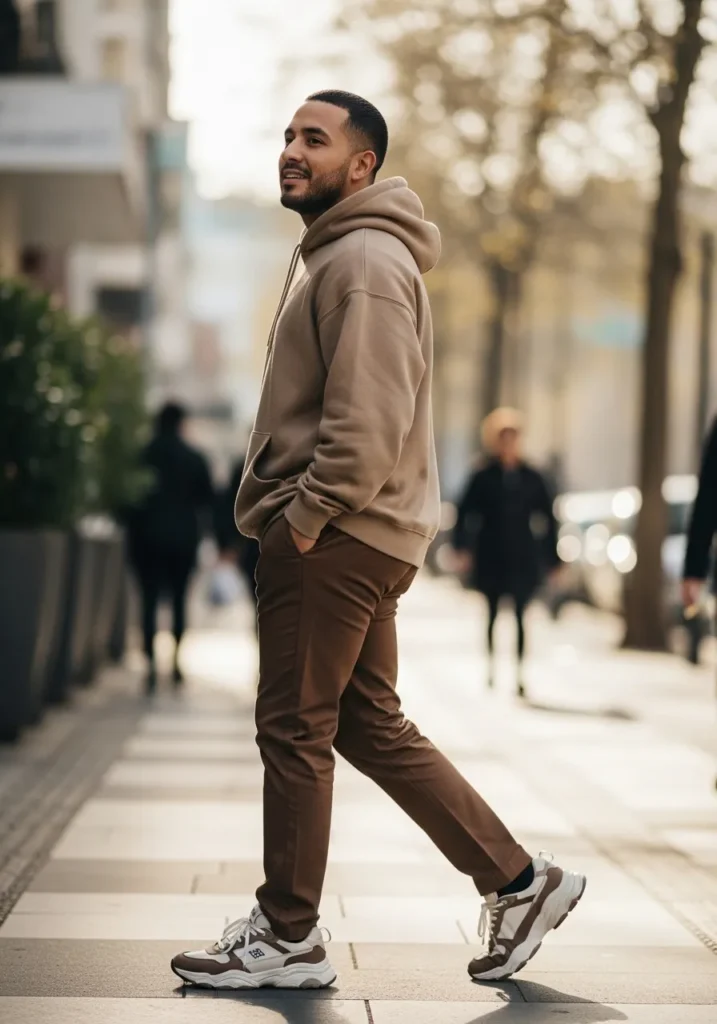 This outfit keeps things relaxed with slim brown pants paired with a soft taupe hoodie. The pants have a clean tailored fit that streamlines the silhouette, while the hoodie adds that cozy everyday feel. Chunky sneakers in neutral tones tie everything together and give the look a sporty edge. The warm brown of the trousers works beautifully with the muted beige on top, creating a balanced and modern color story.