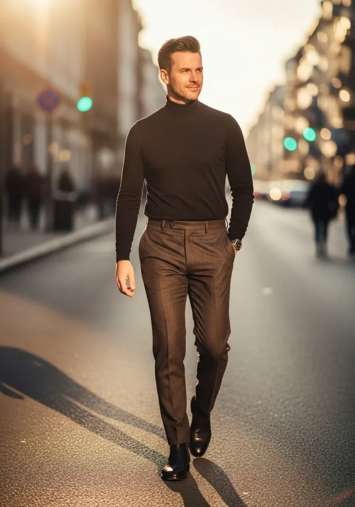 This look pairs tailored brown dress pants with a fitted black turtleneck that creates a sharp, streamlined silhouette. The trousers have a clean front crease and a slim cut that elongates the legs beautifully. Polished black leather boots add a refined finish and keep the palette strong and masculine. The deep brown fabric against the solid black top feels rich, modern, and quietly powerful.