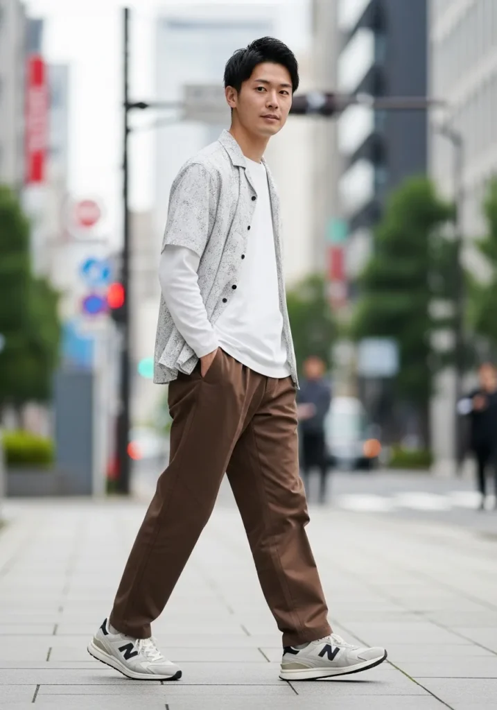 This outfit pairs relaxed brown trousers with a crisp white long sleeve tee and a lightweight short sleeve button down layered on top. The pants have a soft drape and a slightly loose straight leg that gives them a modern, easygoing feel. Classic white and gray sneakers keep the look grounded and practical for everyday wear. The mix of warm brown and cool white tones creates a clean contrast that feels fresh and city ready.