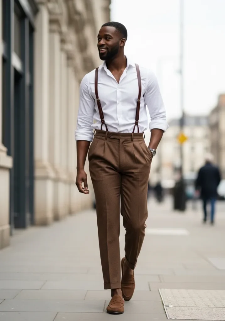 This outfit pairs tailored brown pleated trousers with a crisp white button down shirt worn with the sleeves casually rolled. The high waist and subtle front pleats create a flattering, elongated shape, while rich brown suspenders add a vintage inspired touch. Matching brown loafers keep the color story cohesive and polished. The overall vibe feels refined yet relaxed, like modern gentleman style with a confident twist.