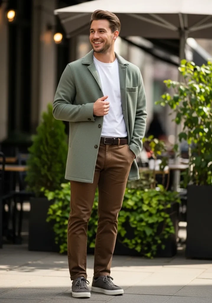I really love how balanced this outfit feels. The olive coat softens the brown pants and makes the whole look more interesting than a basic jacket would. It has that relaxed smart vibe that works for brunch, a casual meeting, or even a low key date. If you are into men who look stylish but still approachable, this brown pants combination is such a sweet spot.