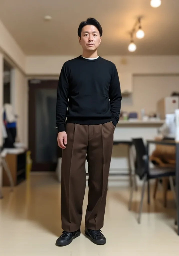 This look keeps things clean and understated with relaxed brown trousers paired with a simple black crew neck sweater. The pants have a slightly wider leg and soft front pleats that give them a modern drape and a bit of movement. Black leather sneakers echo the top and keep the color palette sharp and cohesive. The deep brown fabric against solid black creates a strong, minimal contrast that feels quietly confident.