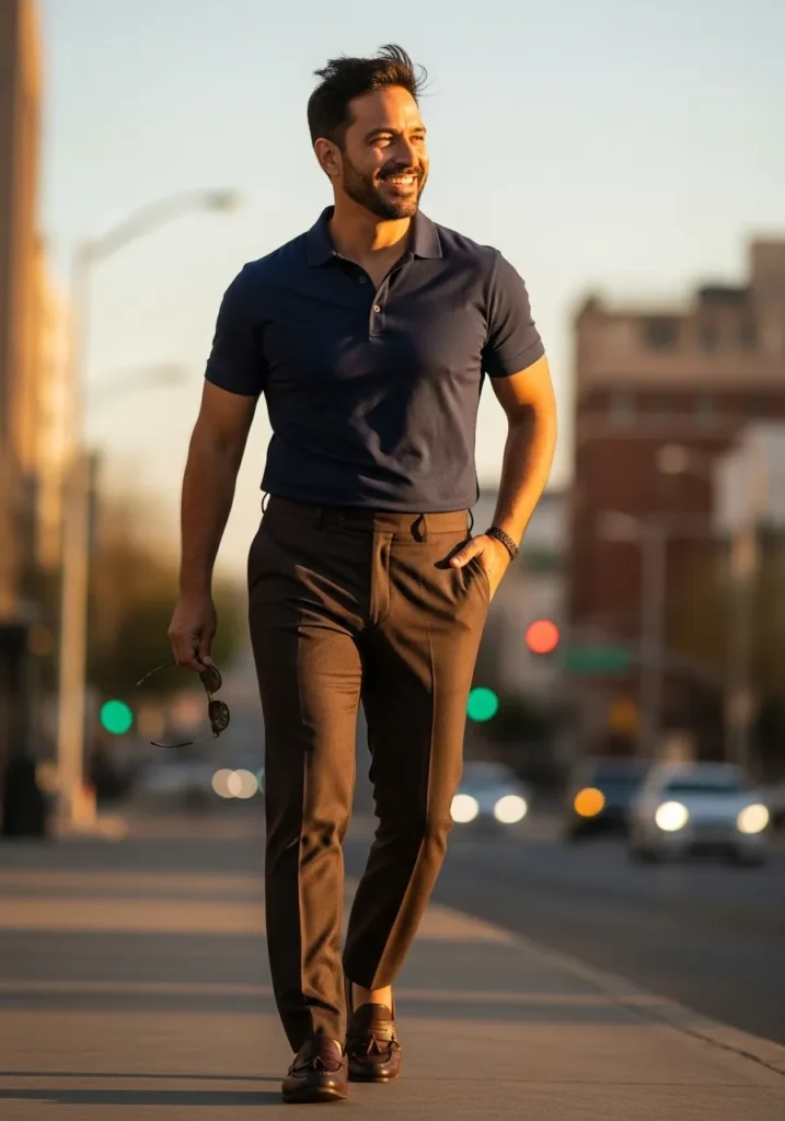 Navy Polo with Tailored Brown Pants at Golden Hour