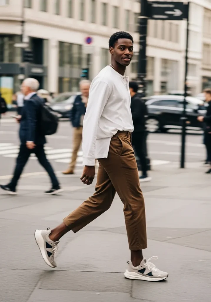 This look is all about clean lines and rich neutral tones. He pairs dark brown tailored trousers with a fitted taupe turtleneck that hugs the frame in a really flattering way. The pants have a sharp crease down the front, giving them a polished feel, while crisp white sneakers keep the outfit modern and wearable. The warm light hitting the brown fabric makes everything feel elevated yet understated.