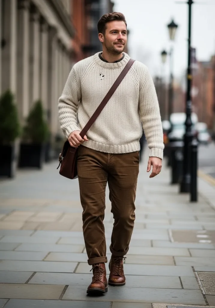 This outfit pairs slim brown pants with a chunky cream knit sweater that looks soft and textured. The pants are slightly rolled at the hem, giving a relaxed touch that works perfectly with sturdy brown lace up boots. A leather crossbody bag adds depth and a practical element without taking over the look. The warm brown tones against the creamy knit create a cozy, autumn inspired feel that looks effortlessly put together.
