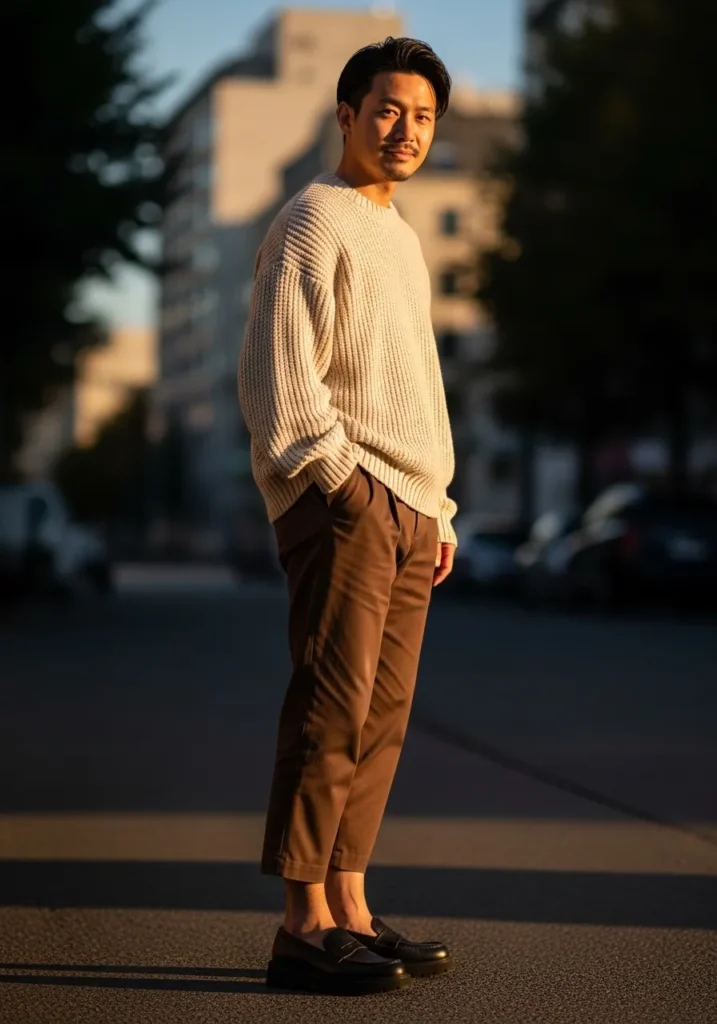 This outfit pairs rich brown cropped trousers with a chunky cream knit sweater that looks soft and slightly oversized. The pants have a clean tailored fit with a subtle taper and a hint of ankle showing, which makes the silhouette feel modern and intentional. He finishes the look with sleek black loafers that add a polished touch without feeling too formal. The warm golden hour light makes the brown tones glow and gives the whole outfit a calm, confident energy.