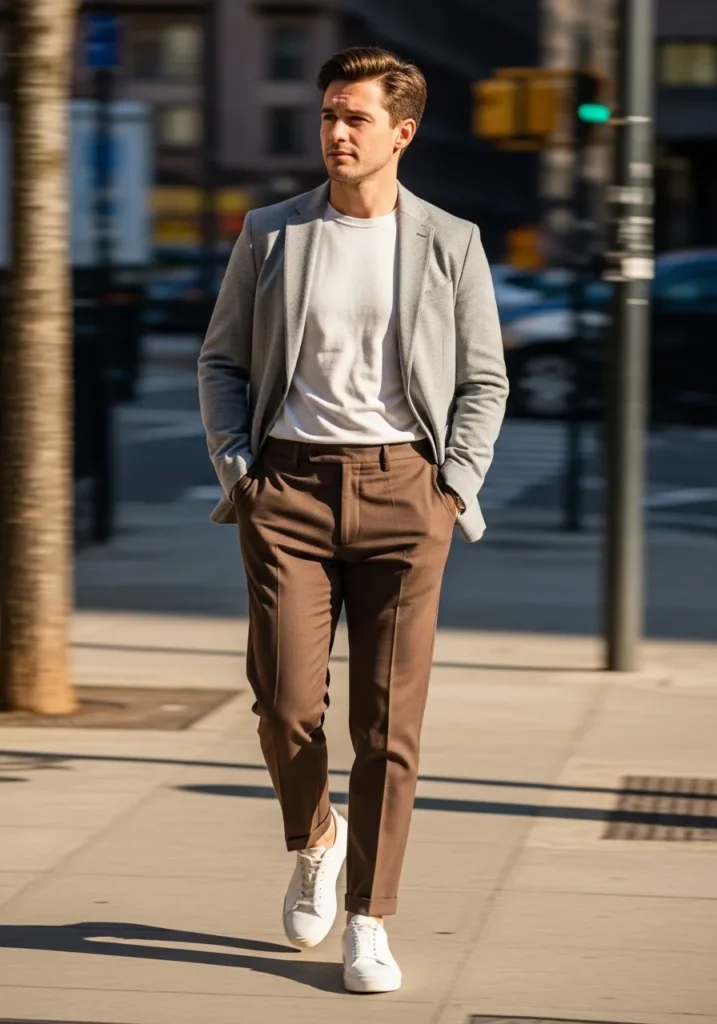 This look combines tailored brown trousers with a clean white crew neck tee and a soft light gray blazer layered on top. The pants have a slim fit with a subtle crop at the ankle, which keeps the silhouette sharp and modern. Crisp white sneakers add a relaxed twist and prevent the outfit from feeling too formal. The warm brown tone against the cool gray creates a balanced and contemporary color pairing that feels city ready.