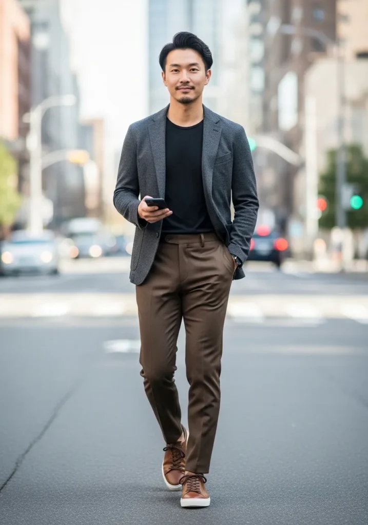 I love how effortlessly cool this combination feels. The charcoal blazer sharpens the outfit, but the black tee keeps it from looking too formal. The brown pants bring warmth and personality, which makes the whole look more interesting than classic black trousers. If you are into men who look like they can go from meetings to dinner without changing, this brown pants pairing is such a stylish inspiration.