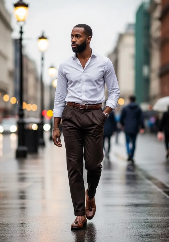 This outfit features deep brown pleated trousers with a tailored fit and a clean cuff at the ankle. He pairs them with a light gray fitted button down shirt tucked in neatly, finished with a classic brown leather belt. The rich brown loafers tie everything together and echo the tone of the pants without looking too matchy. The fabric has a soft sheen that catches the light on the wet city street, giving the whole look a refined, confident vibe.
