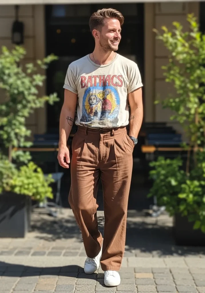 I love how this outfit proves that brown pants do not have to feel formal. The structured trousers elevate the playful graphic tee, which makes the whole look feel intentional instead of thrown together. It has that effortless coffee date energy that we all secretly appreciate. If you are into men who can mix vintage vibes with clean tailoring, this one is such a charming win.