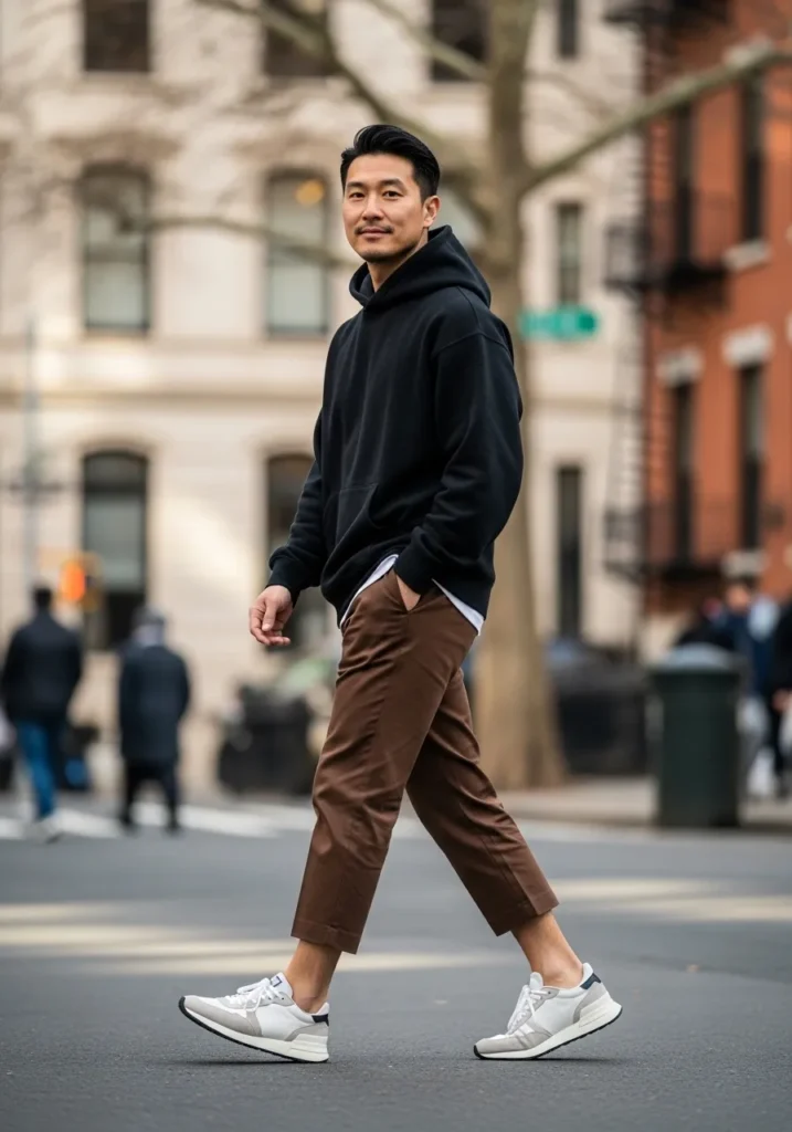 This outfit pairs cropped brown trousers with a relaxed black hoodie layered over a longer white tee. The pants hit just above the ankle, giving a modern silhouette that feels intentional and fresh. Light gray athletic sneakers keep the look grounded and comfortable, while the rich brown fabric adds warmth against the darker top. The mix of tailored trousers and sporty layers creates that cool city energy that feels effortless.