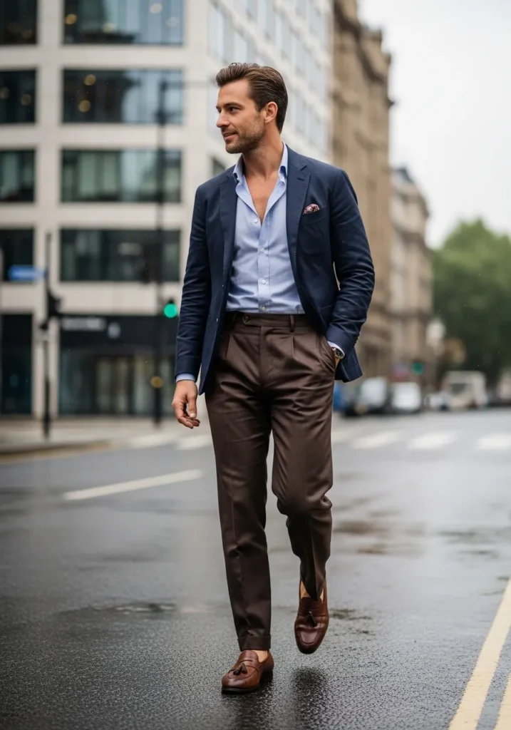 Navy Blazer with Dark Brown Trousers for City Sophistication