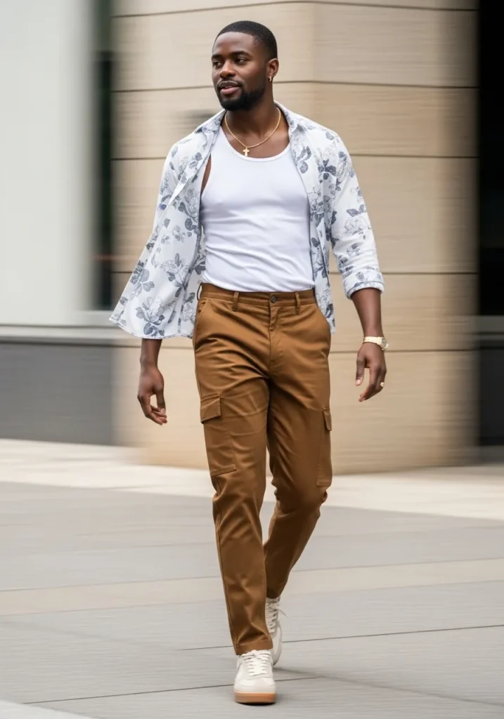 This look features slim brown cargo pants with subtle side pockets that add just enough edge without feeling bulky. He pairs them with a fitted white tank and layers a lightweight patterned button down worn open for a relaxed feel. Crisp white sneakers keep the outfit fresh and clean, while simple gold accessories bring in a hint of personality. The rich caramel tone of the pants stands out beautifully against the soft neutrals on top.