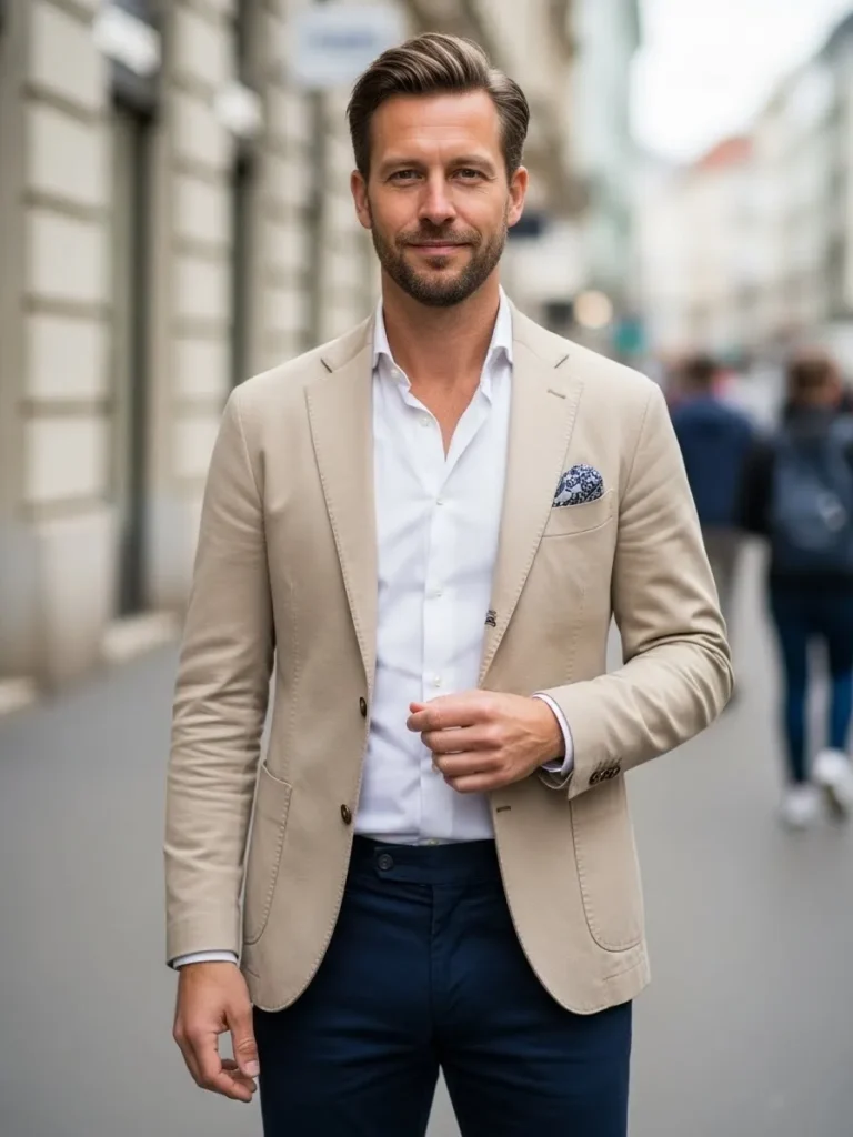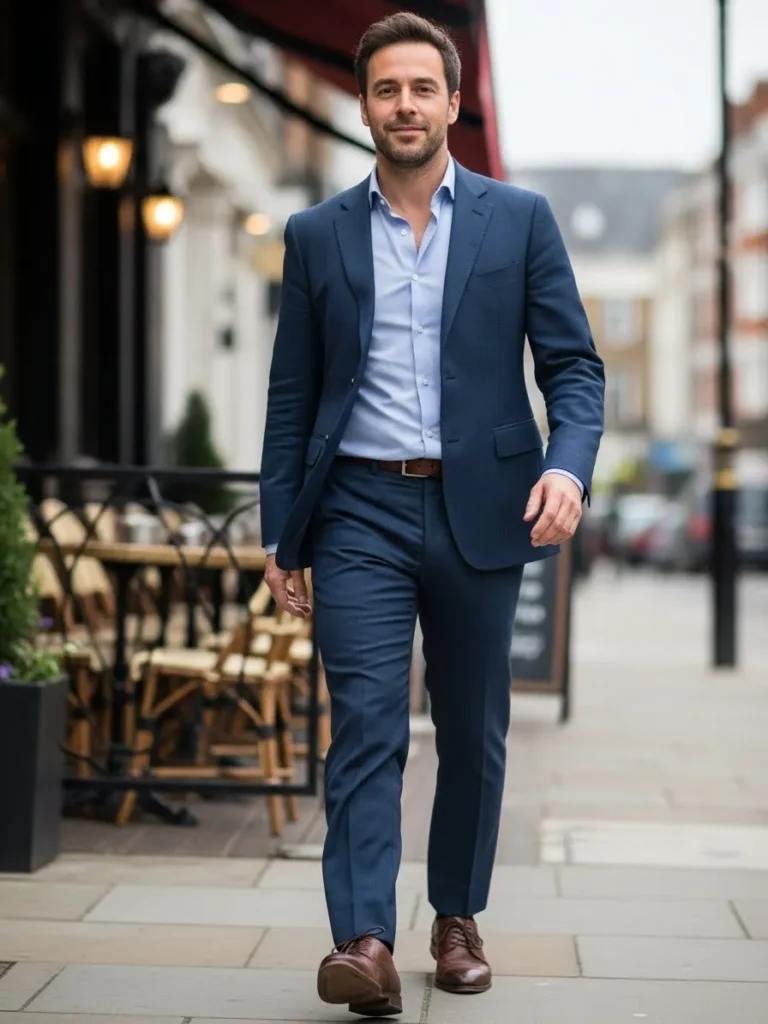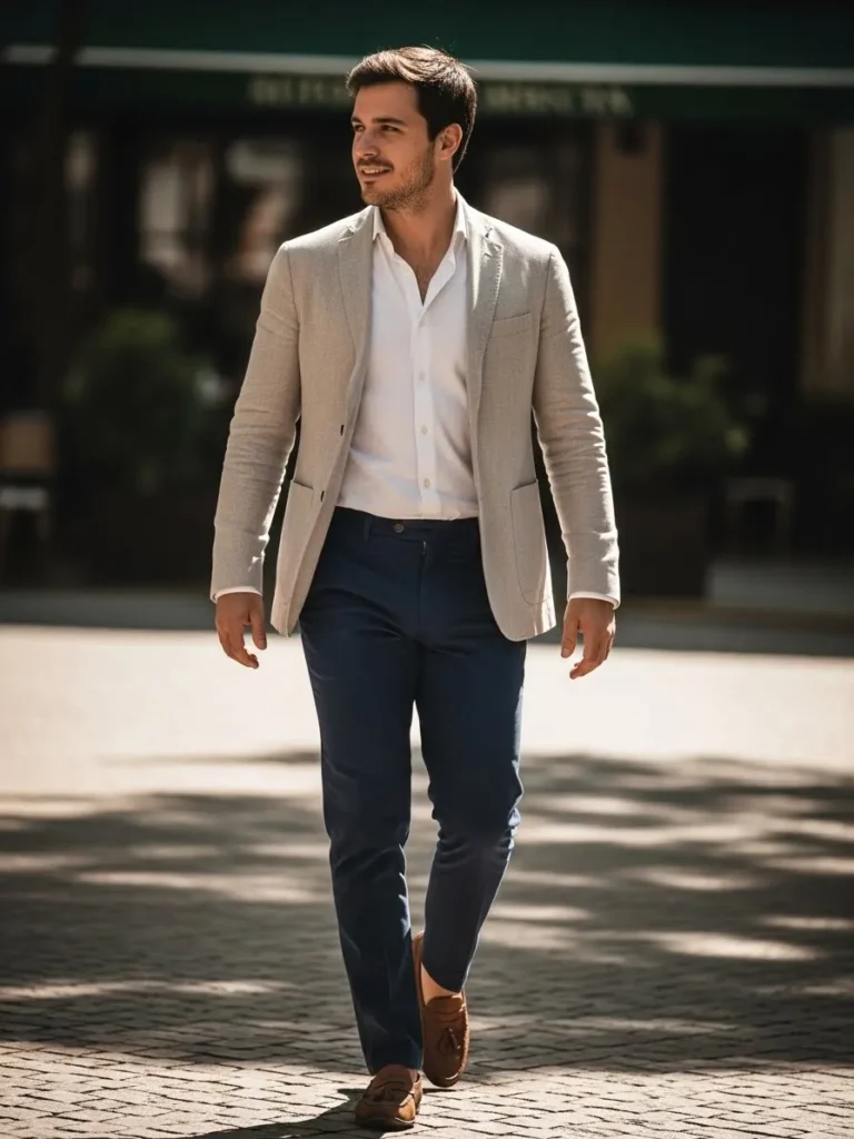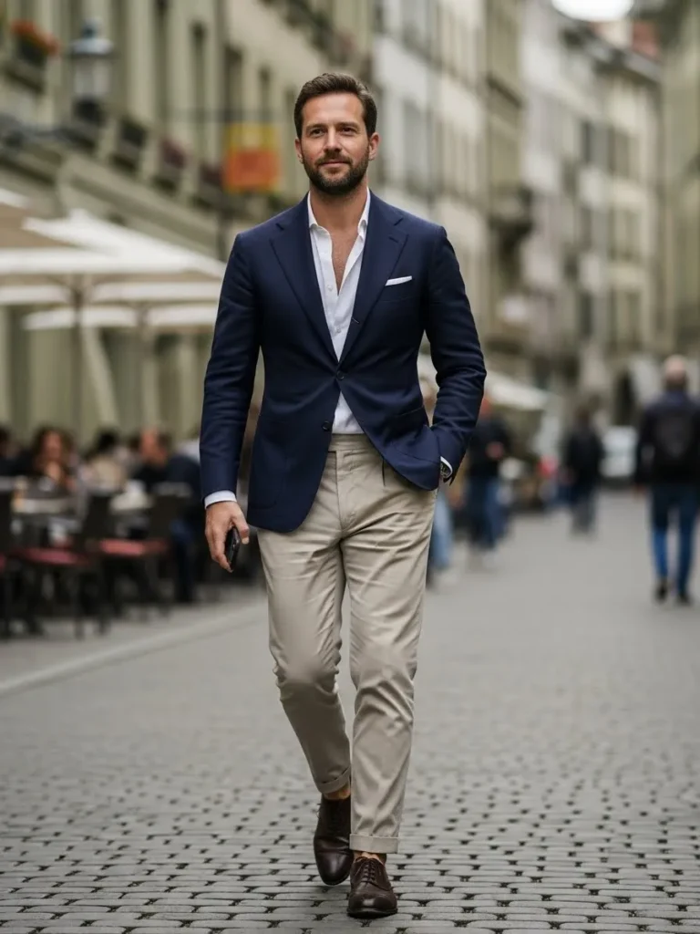 This look combines a dark tailored blazer with a crisp white shirt and light beige trousers. The contrast feels sharp and well balanced. Brown leather shoes finish the outfit perfectly.