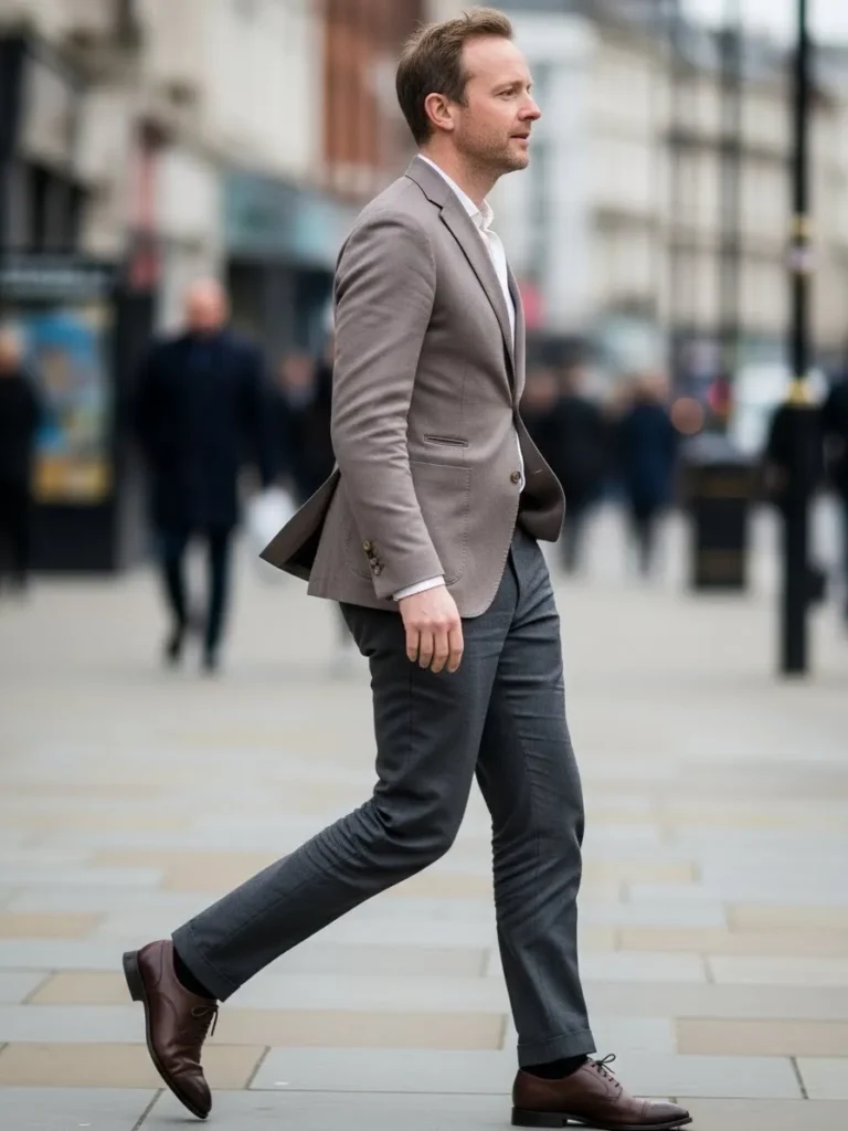 Here we see a soft taupe blazer styled with a light shirt and dark slim fit trousers. The neutral tones feel calm and polished while the fit keeps it modern. Brown shoes tie everything together nicely.