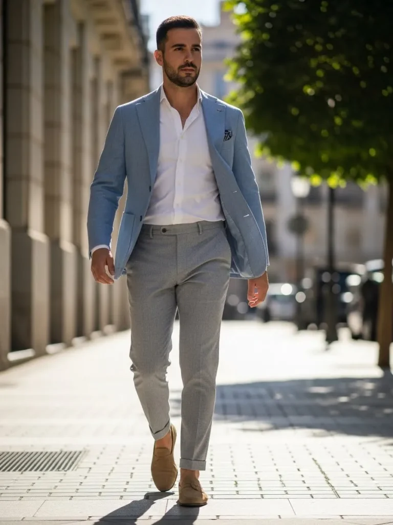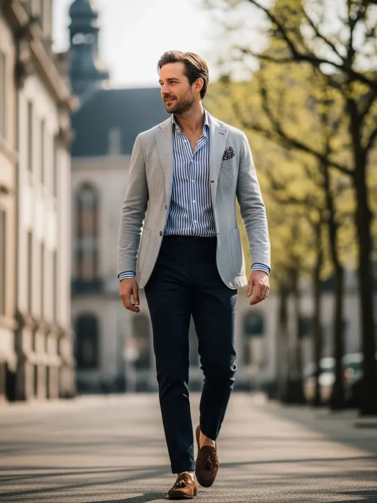 Here we have a light gray blazer styled with a white shirt and soft cream trousers. Brown loafers add warmth and keep the look semi formal rather than stiff. The colors feel clean and airy which fits spring perfectly.