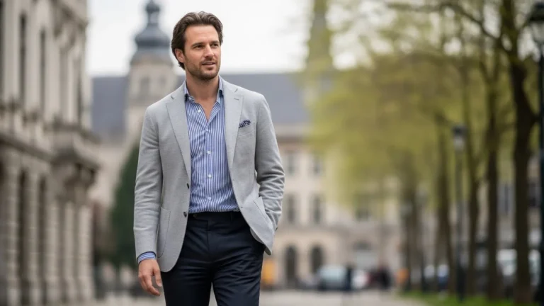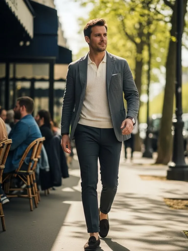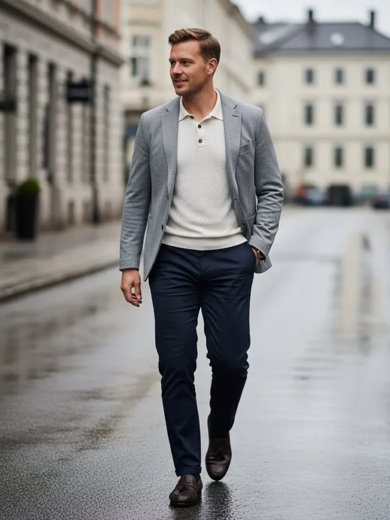 Here we have a soft gray blazer layered over a light knit polo with dark trousers. The textures feel relaxed while the tailoring keeps it polished. It is a great balance of comfort and style.